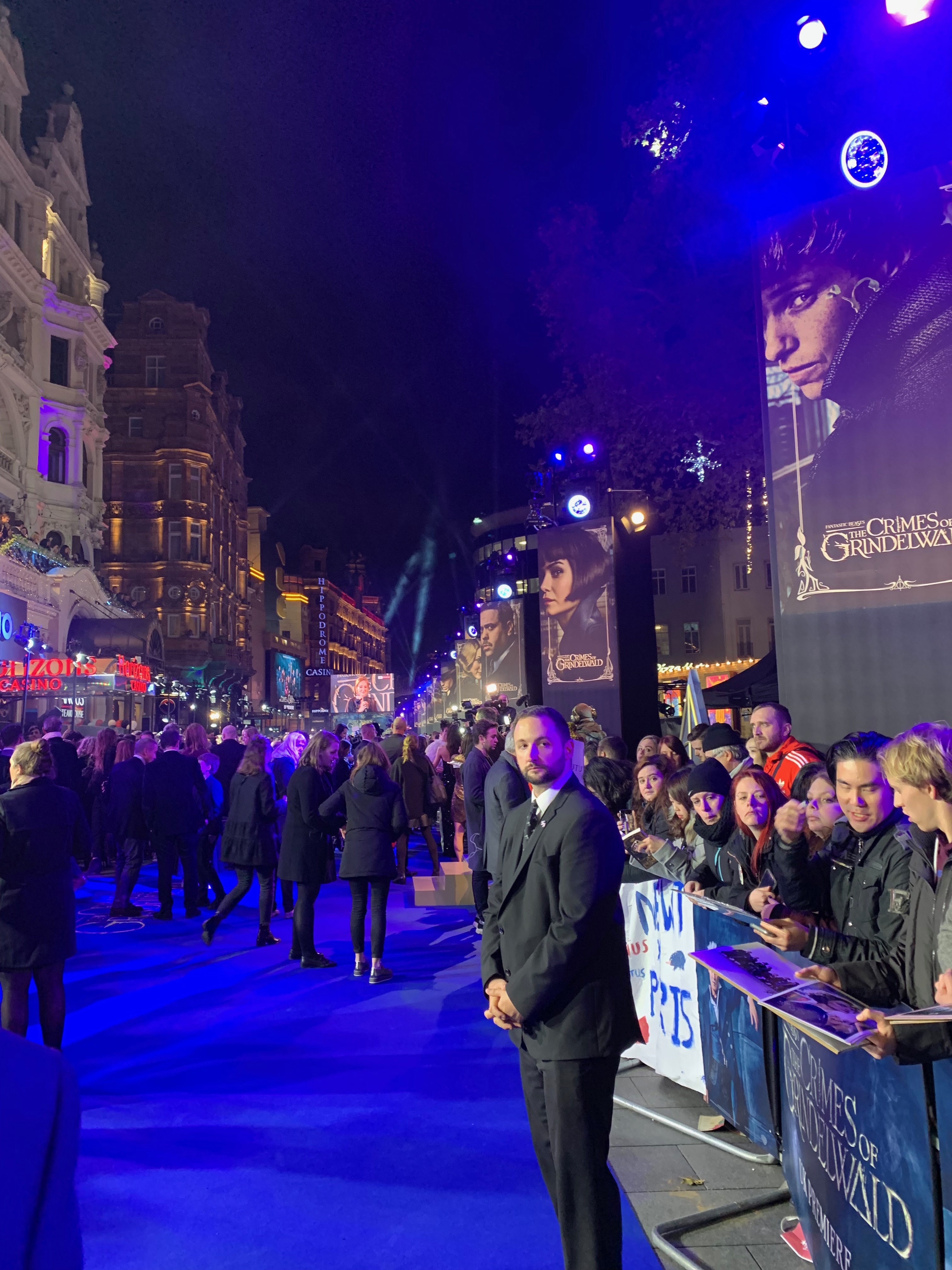 Before the red carpet event kicked off, we had a few drivers pick us up to take us over to Leicester Square and drop off us at the front where all the stars came in. We were literally entering in the same spot as Jude Law, Eddie Redmayne, Johnny Depp, Callum Turner, JK Rowling and the rest of the really important people. In fact, right as we were entering Alison Sudol was taking her entrance photos! Also William Nadylam arrived as we were awaiting the rest of our crew.